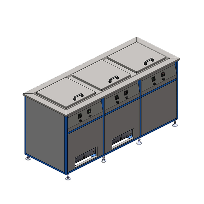 多槽式超声波清洗机系统,是本公司结合国外清洗机的特 点精心设计的,主要运用单晶硅片、电子零件、光学镜片、小五金和I机加工精密机械零件等行业。 三槽式超声波清洗机系统本系列的清洗系统具有以下特点: