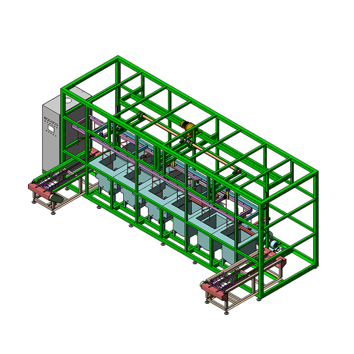 ---本设备为多臂式清洗线,清洗部分传动形式采用多臂机械手吊篮式清洗,进出料采用不锈钢链条输送,自动传送定位,运行安全可靠,使用寿命长。