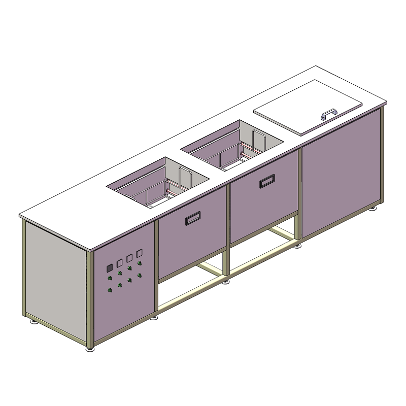 多槽式超声波清洗机系统,是本公司结合国外清洗机的特 点精心设计的,主要运用单晶硅片、电子零件、光学镜片、小五金和I机加工精密机械零件等行业。 三槽式超声波清洗机系统本系列的清洗系统具有以下特点: