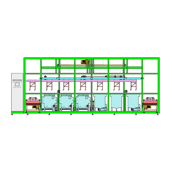 ---本设备为多臂式清洗线,清洗部分传动形式采用多臂机械手吊篮式清洗,进出料采用不锈钢链条输送,自动传送定位,运行安全可靠,使用寿命长。
